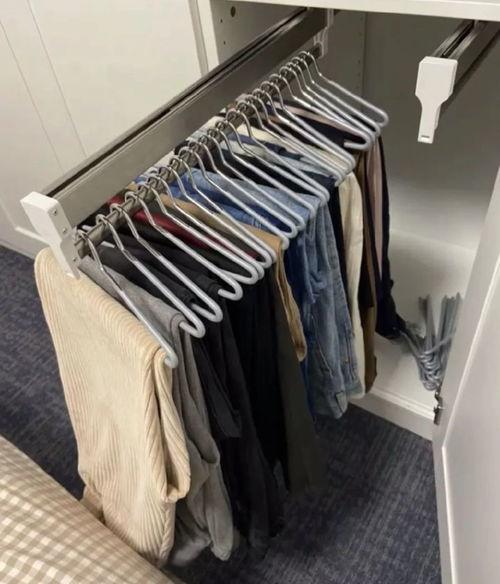 1. 悬挂收纳:如果你家的衣橱空间足够,可以选择悬挂收纳。将折叠好的裤子挂在衣架上,这样既方便拿取,又节省空间。